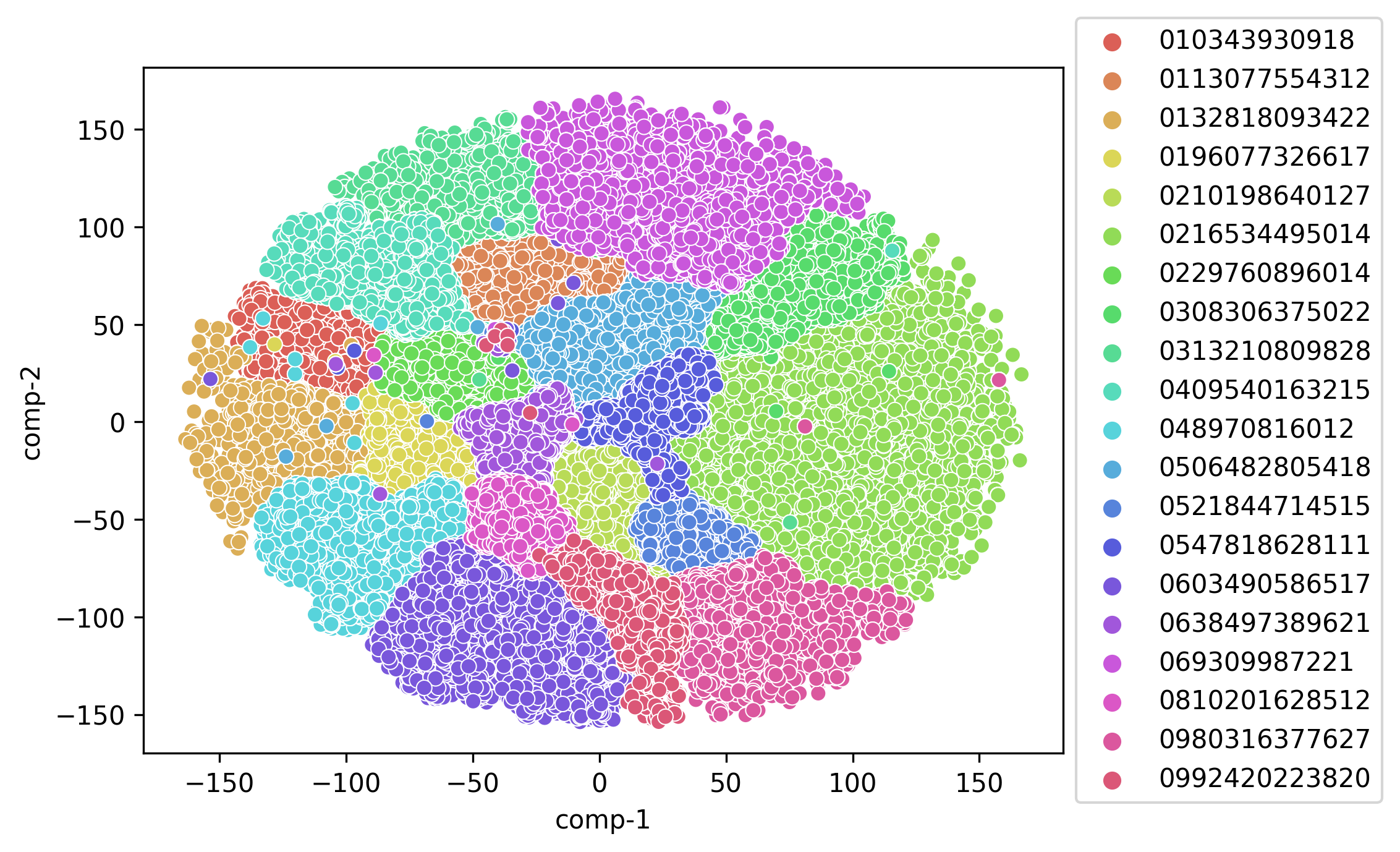 The first thing I examined, was whether the voiceprints were separable at all. That is, can they be grouped by different speakers? For this, I used T-SNE to create a graph of all the voiceprints used. If speeches cluster together by speaker, this indicates that there are likely many similarities between them. One drawback is that if some speeches end up behind another group, we will not be able to see this.