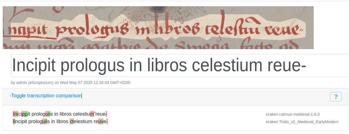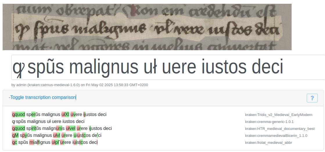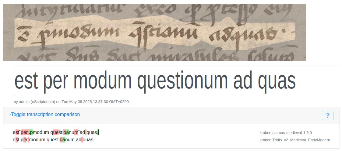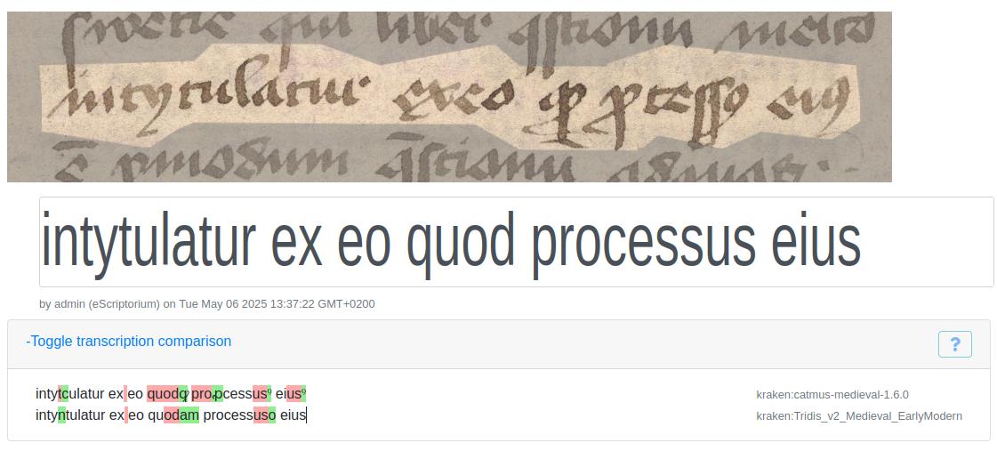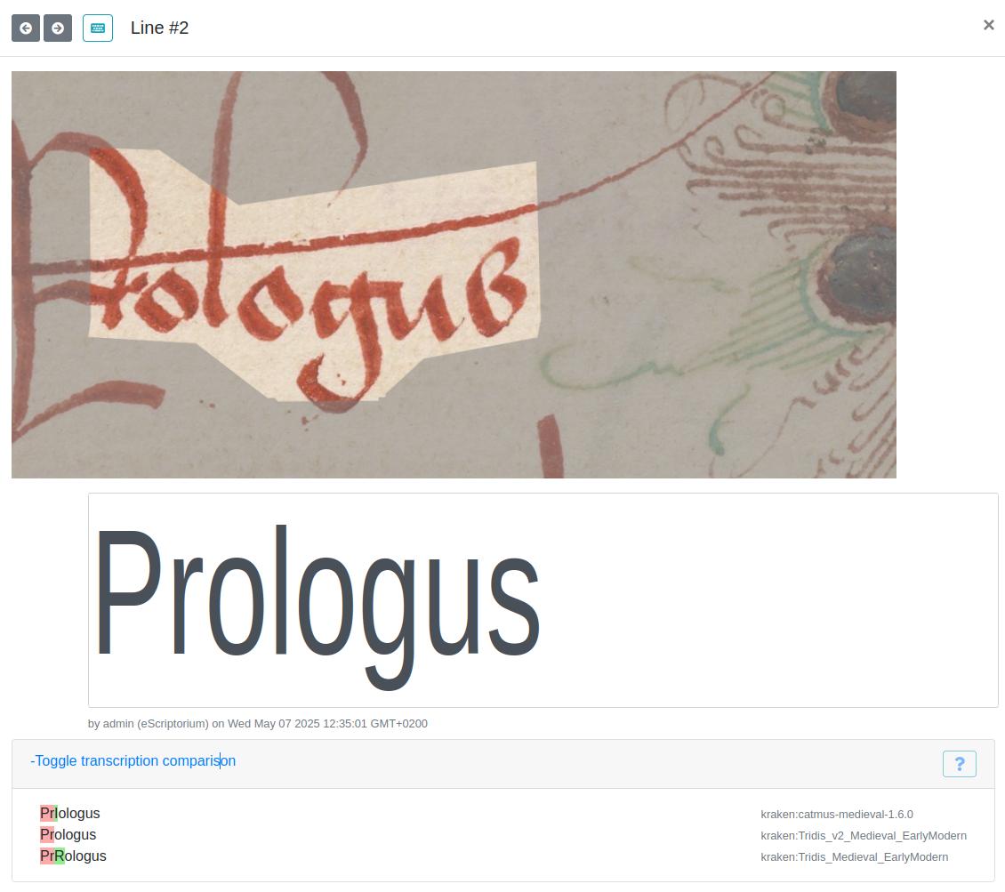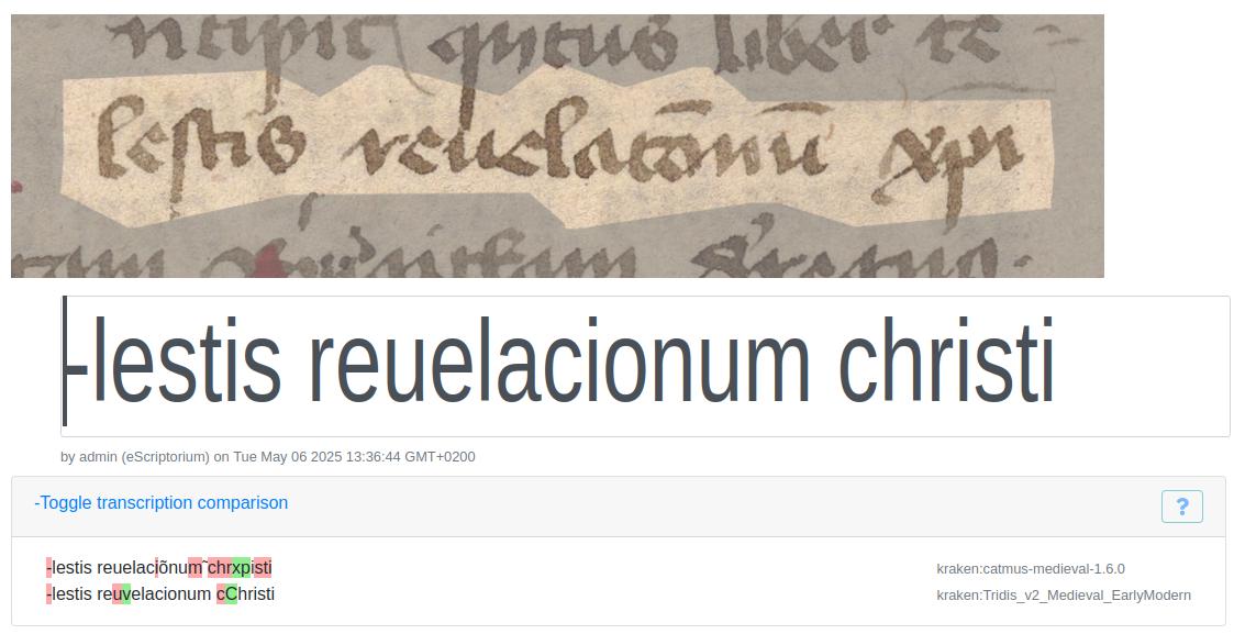 The user interface of eScriptorium makes it simple to compare the outputs of different HTR models. As Figure 5 shows, the GUI displays a manuscript excerpt alongside a manual line-by-line transcription and the results from various models (e.g., catmus_1.6.0 and tridis_v2). Insertions are highlighted in green, deletions in red. In our experiments, all manual transcriptions were done line by line, with hyphens marking words split across lines. Abbreviations were expanded - though without special notation - and the original orthography was preserved throughout.