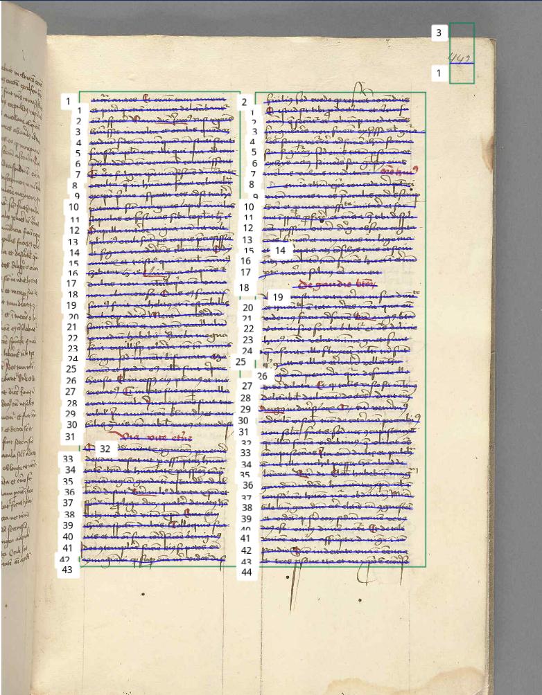 We tested the default segmentation mode in Transkribus and encountered segmentation challenges similar to those observed in eScriptorium. In particular, the default segmentation model performs best on single-column layouts. In the example shown below (see Figure 11), it incorrectly interpreted both columns of a page as a single region. As a result, the reading order became distorted: instead of reading the columns top-to-bottom, the engine processed the text line-by-line across the full page width from left to right. This produces transcriptions that are jumbled and difficult to interpret.