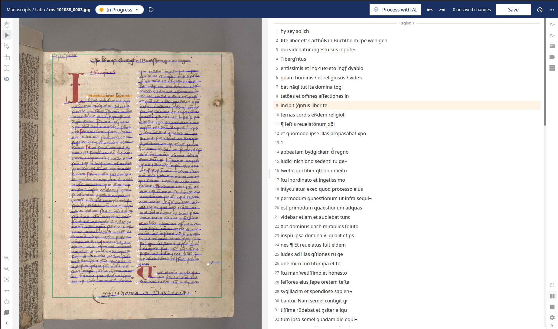 Like Transkribus, eScriptorium is a platform designed to manage transcription workflows. It supports both manual and automated processes for annotation, segmentation and model training. The software was developed as part of the Scripta project at the École Pratique des Hautes Études, Université Paris Sciences et Lettres (EPHE–PSL).