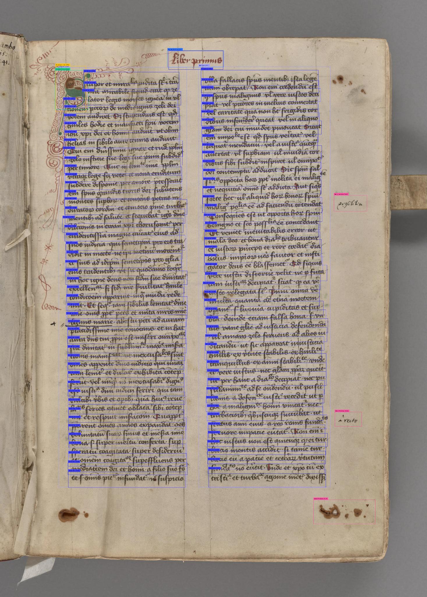 Figure 3: Outputs from Kraken’s segmentation model, when applied to A 68, f. 207v (left) and A 70 f. 1r (right).