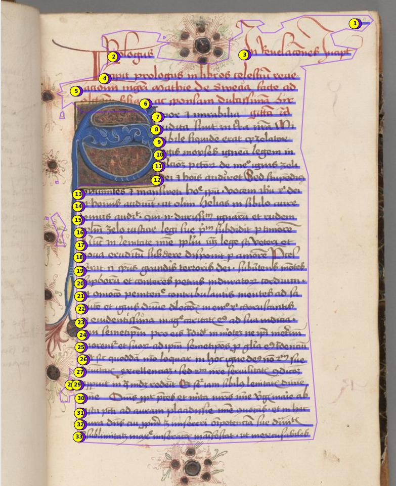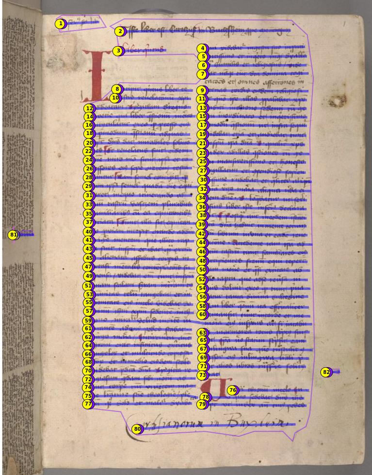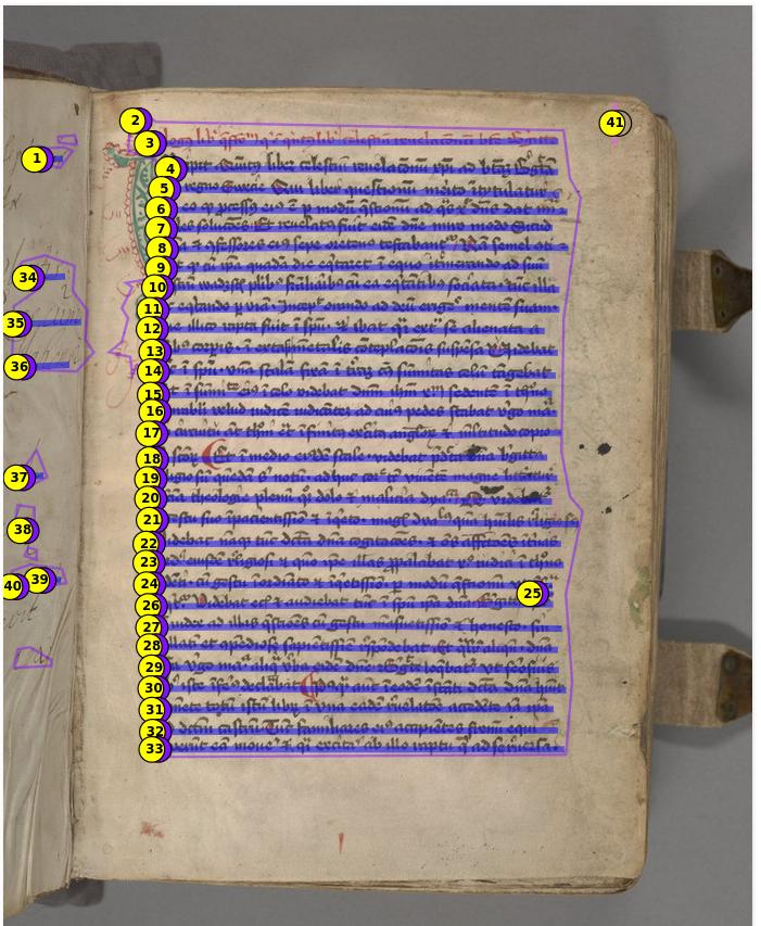 We applied the model to two single-column pages and three double-column pages. The images below show how the segmentation output highlights detected regions (in violet) and text lines (in blue). The yellow circles indicate the proposed reading order, which determines the sequence in which the transcribed lines will be arranged.
