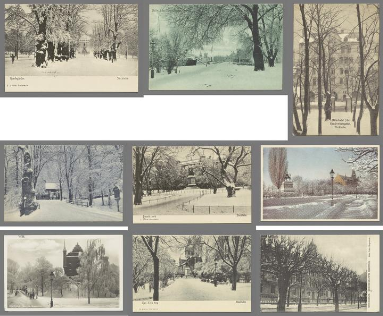 To explore the potential of CLIP-Topic, we recently applied it to a collection of historical postcards. Even in this modest experiment, the clustering surfaced clear thematic groups. One contained snowy cityscapes: winter streets, dark skies, and drifting snow rendered in different artistic styles (see Figure 1). Another grouped images of parades and military formations, bringing together items dispersed across the collection (see Figure 3). These clusters provided a fast way of seeing what kinds of motifs recur across thousands of images. For institutions with large quantities of under-labelled visual material, this offers a practical route to understanding a collection’s thematic range without requiring exhaustive manual work.