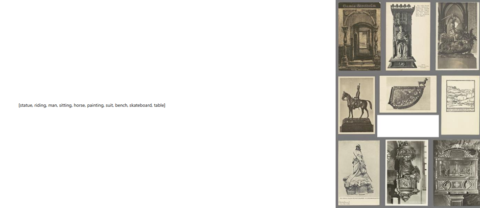 • Risk of anachronism. Because CLIP is trained on contemporary web data, it has a tendency to project modern associations onto historical images. This is not usually a problem for broad visual features, but it becomes more delicate when dealing with historically specific motifs. In one experiment, a cluster of church interiors and museum objects was labelled with terms including “skateboard” (see Figure 4) — a reminder of how training data shapes interpretation (Smits and Wevers 2023).