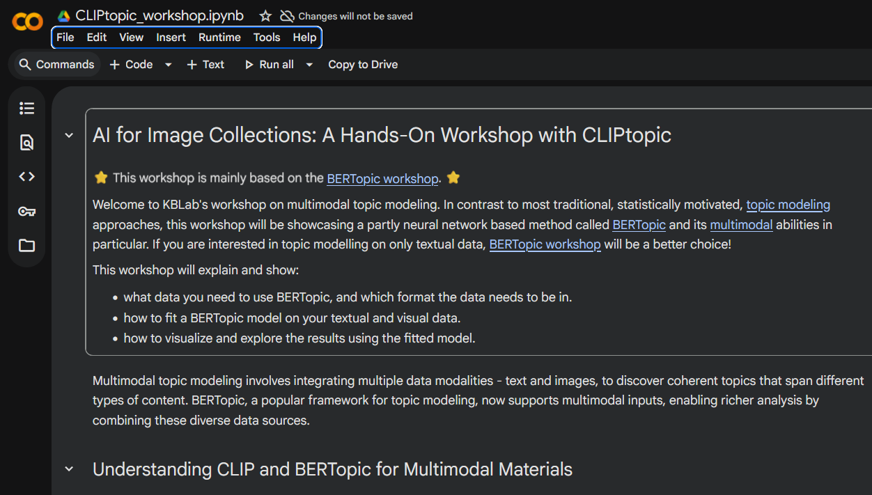 As part of this work, we have also created an openly accessible Google Colab notebook designed to help users experiment with CLIP-Topic in a hands-on way. Developed within the national infrastructure Huminfra, the notebook introduces the method through a small, curated set of images from DigitaltMuseum and combines brief explanatory notes with runnable code cells. Because everything runs in the browser — no installation, no setup — it offers a low-barrier way of seeing how the workflow unfolds in practice. More importantly, it is meant to be revisited and adapted: the notebook can be explored at one’s own pace and reused with local collections, supporting both experimentation and understanding (Sikora 2024).